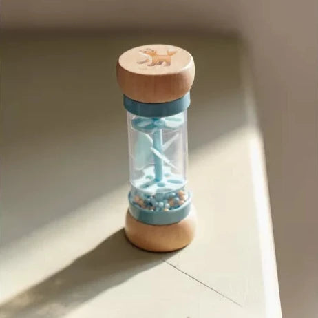 Shake and rattle! Turn the rain rattle and listen to the soothing sound of the balls moving from one side of the rainmaker to the other. It stimulates the sensory development and musical talent of your baby. The balls fall through small openings in the tube and rotate the propeller, resulting in a pleasant sound. The rain rattle is designed for little hands and is comfortable to hold. The wooden top and bottom are decorated with an illustration of a little fox and a pair of mushrooms from the Forest Friends collection.