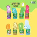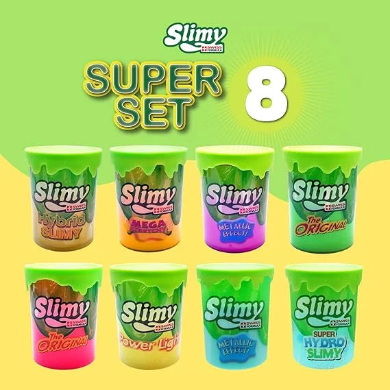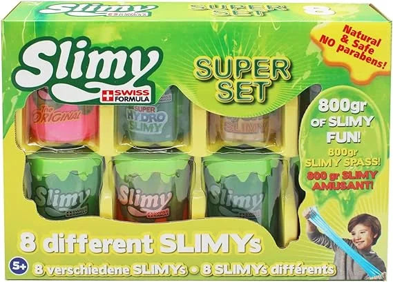 • Contains: 2 x 100g Original Slimy Cups – Green & Pink, 2 x 100g Metallic Slimy Cups – Blue & Purple, 1 x 100g Slimy Mega Stretchy Beaker – Orange, 1 x 100g Slimy Hybrid – Gold, 1 x 100g Slimy Power Light – Glow in the Dark, 1 x Cup Super Hydro Slimy – Blue With water beads