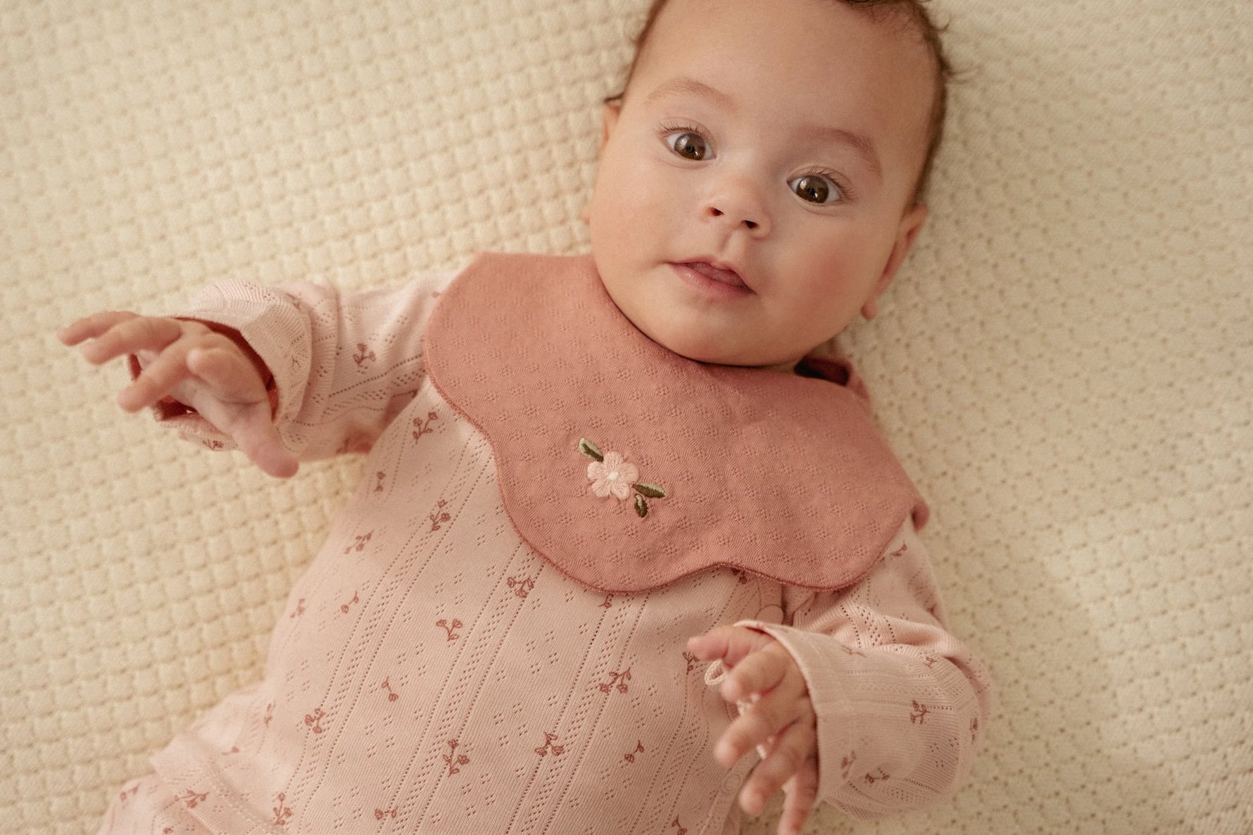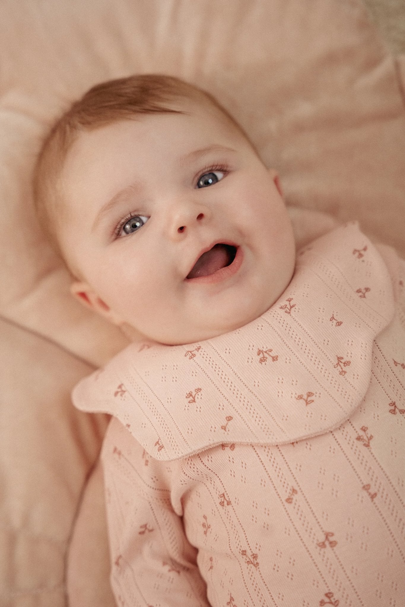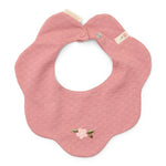A bib of a ruffle! Add a touch of style to dinner time with these bibs that look a bit like a ruffled collar. The wavy shape of the bibs makes them both practical and stylish. Made of soft organic cotton and equipped with adjustable press studs, these bibs ensure a perfect fit that grows with your little one. The light pink bib has a fine pointelle structure, while the plain colored bib is decorated with cute flower embroidery. They fit perfectly with your baby's outfit and combine seamlessly with the other items from the Fairy Garden collection. Available in one size.