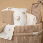 No more messy nappies, tubes and bottles: this Little Dutch commodity basket keeps the changing table nice and tidy and organised! The Little Dutch commodity basket is beautifully finished and offers a storage place for all the products you need to care for your baby every day. A lovely accessory for the nursery. Made of a knitted fabric in 100% organic cotton and oekotex certified. The basket is reinforced, so it will also hold up well without or with few items in it. The basket has a wrap-around edge, allowing you to use the basket in 2 heights. The inside also has the knitted fabric, giving it a luxurious look. If you no longer use the baskets for the baby's room, they also look great as accessories in the living room.