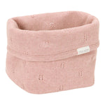 Keep the changing table neat and organised with this storage basket. Made of knitted 100% organic cotton with reinforced sides, it offers ample room to store all your daily baby care essentials, including nappies, tubes and bottles. The wrap-around edge allows you to use the basket in two heights. Featuring an intricate pointelle design of delicate leaves and a sweet Pure Blossom color, it adds a classic and romantic touch to any room. Available in two sizes.
