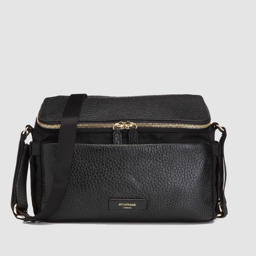 The chicest way to carry your essentials on short trips out with baby. Crafted from responsibly sourced leather and durable nylon, the thoughtfully designed wide main opening gives you easy access to the spacious interior while the external zipped pocket is perfect for storing valuables. Keep drinks upright with the built-in insulated sleeve or external side pockets and easily attach to your pram with our patented stroller straps built-in to to the crossbody strap. This 2-in-1 stroller organiser and compact changing bag simply has it all.