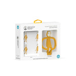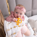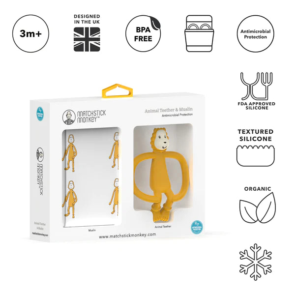 • Gift pack of silicone animal teether and 100% organic cotton muslin
