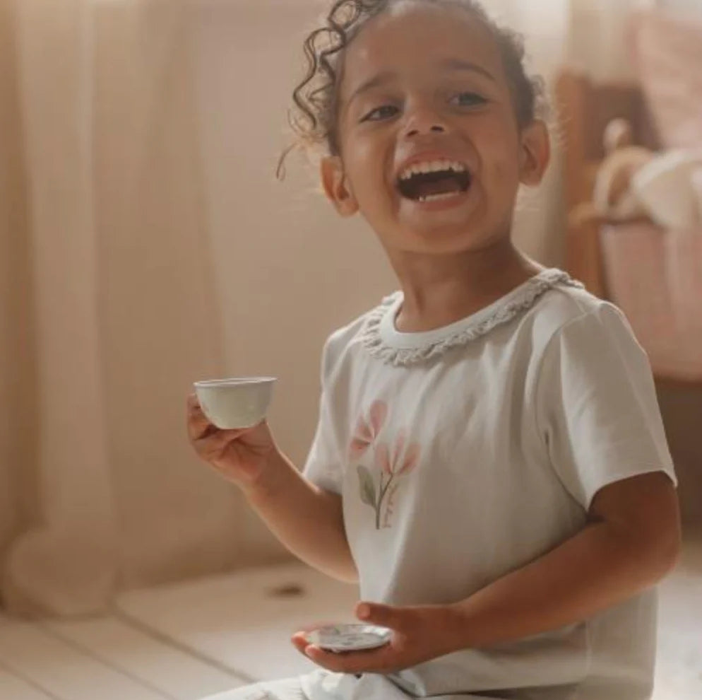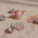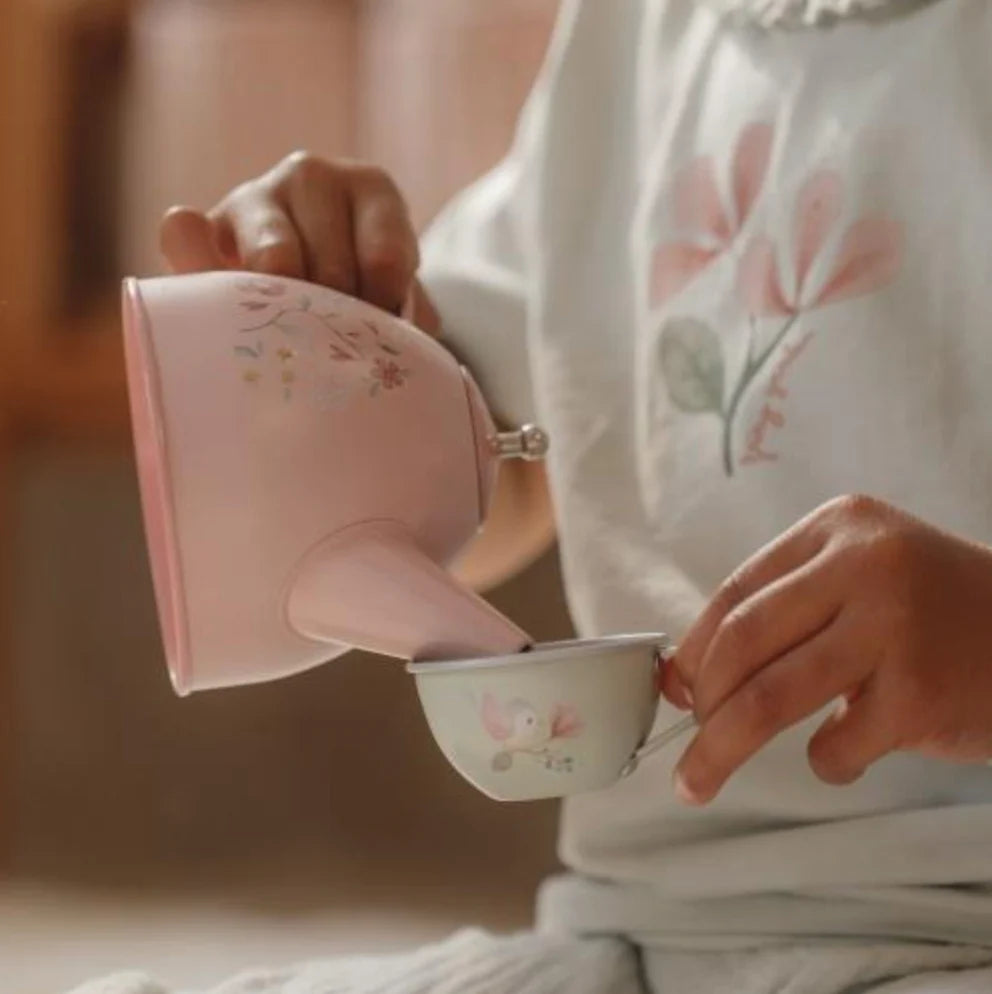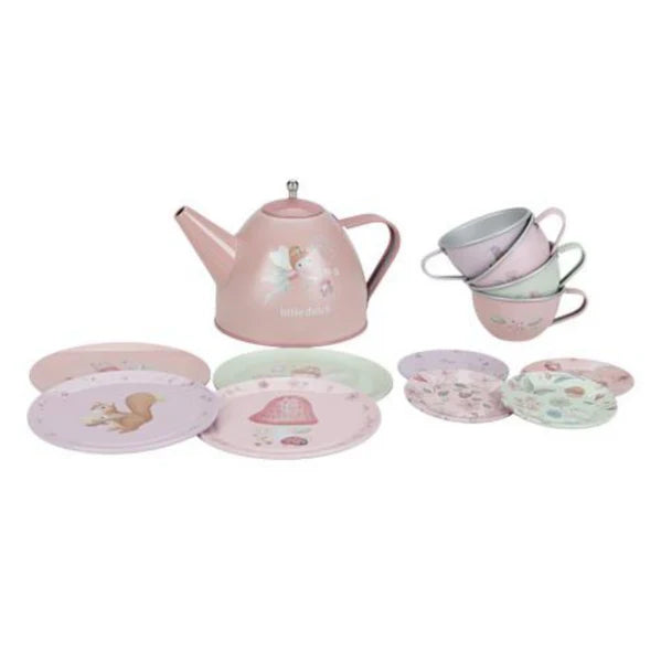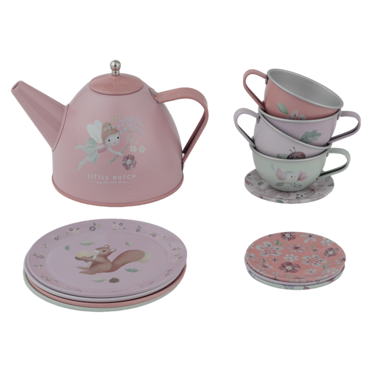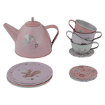 Shall we have tea? Your child will enjoy hours of role playing with this cute little tin tea set. This Fairy Garden tea set stimulates children's imagination and encourages fine motor skills. The set includes four small tea cups, four saucers, four cake plates, and a teapot with lid. Please note: dry the tea set well after use. Packaged in a window box. Suitable for children from 36 months.