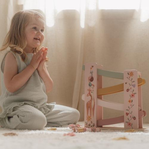 Count down from 3, then let the magical journey begin! Delve into the enchanting layers of the Fairy Garden, where the cutest animals play amidst vibrant flowers. This captivating wooden ramp racer features four vehicles, each adorned with charming drawings of woodland creatures. Watch in delight as the hedgehog, butterfly, ladybug, and bird take their thrilling turns atop the race track, descending in a flurry of excitement. Get ready, young adventurers, for an enchanting ride through the beautiful world of the Fairy Garden!