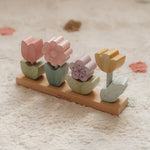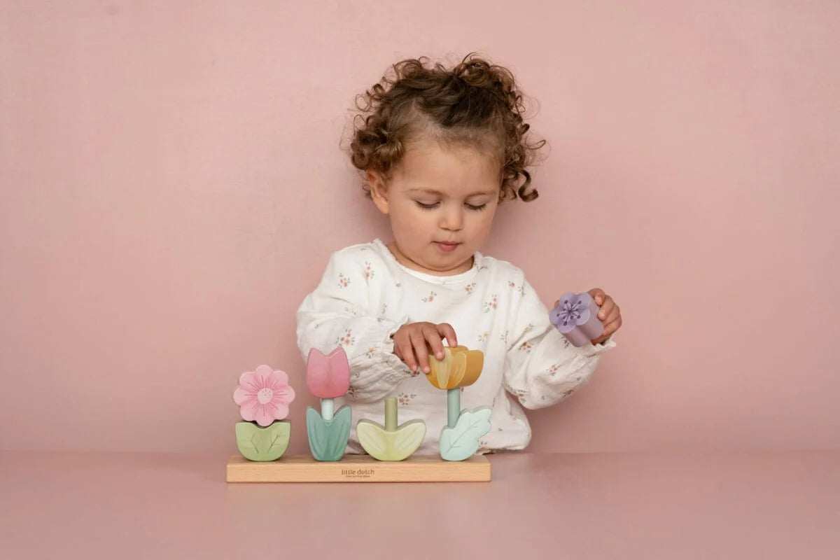 Let's build a garden of flowers together! Mix and match the blocks and create a row of four magical flowers from the Fairy Garden collection. Place the blocks onto the holder one by one and practice your hand-eye coordination. A fun play and learn stacking puzzle that also makes for a lovely decorative ornament in your nursery.