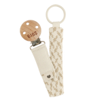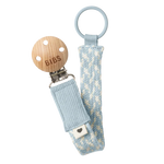 The Pacifier Clip cannot withstand being washed in the washing machine due to the wooden details and metal clip. If the product needs to be cleaned, you can spot-clean with warm water and mild soap. Afterward, take a towel and absorb the water from the fabric, and if the wood and metal clip has been exposed to water, remember to wipe them off thoroughly. Keep the metal clip open and let it air dry to make sure it is completely dry.