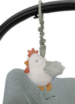 Move around! This cheerful little chicken is designed with playful textures. If you pull on her, she starts to vibrate. You can easily attach this fun toy to a car seat, a playpen or a stroller. Made for little hands to grab, it provides endless entertainment at home and on the go. Laughter and giggles guaranteed.