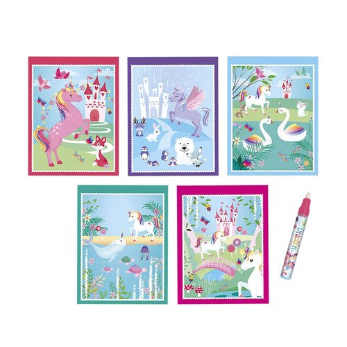 Endless coloring with water, ideal! Discover how creative you can be with water and bring these magical unicorns to life. Ideal for little princesses and future artists! Fill the included special pen with water and start drawing. When water hits the paper, the most beautiful drawings of all kinds of beautiful unicorns appear. When the paper dries you can recreate the five drawings, so you can have fun again and again. Handy for at home and on the road!