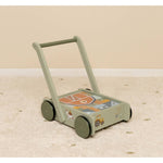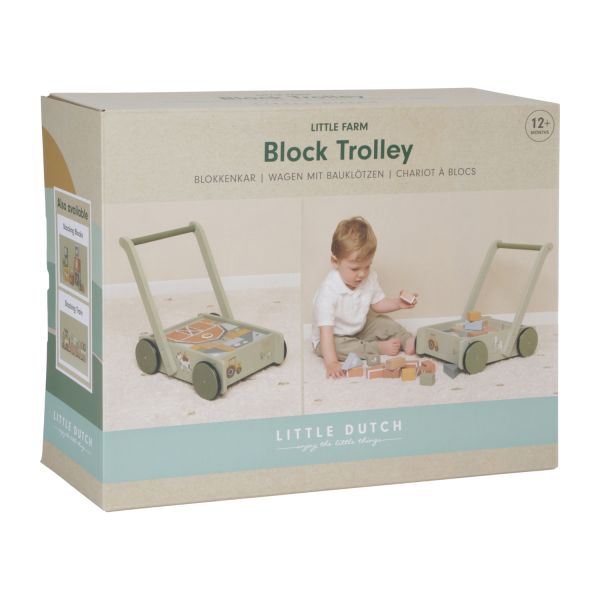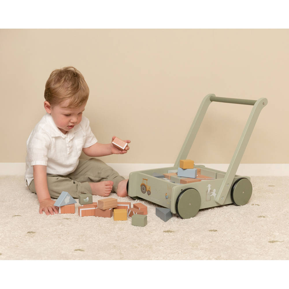 The wooden block cart is equipped with wooden wheels and filled with colored wooden blocks featuring beautiful illustrations from the Little Farm collection. The different sizes of the blocks promote children's recognition of colors and shapes. The handle is at the right height for toddlers so they can walk around the room comfortably. This cheerful block cart guarantees hours of building fun. Assembly by an adult required.