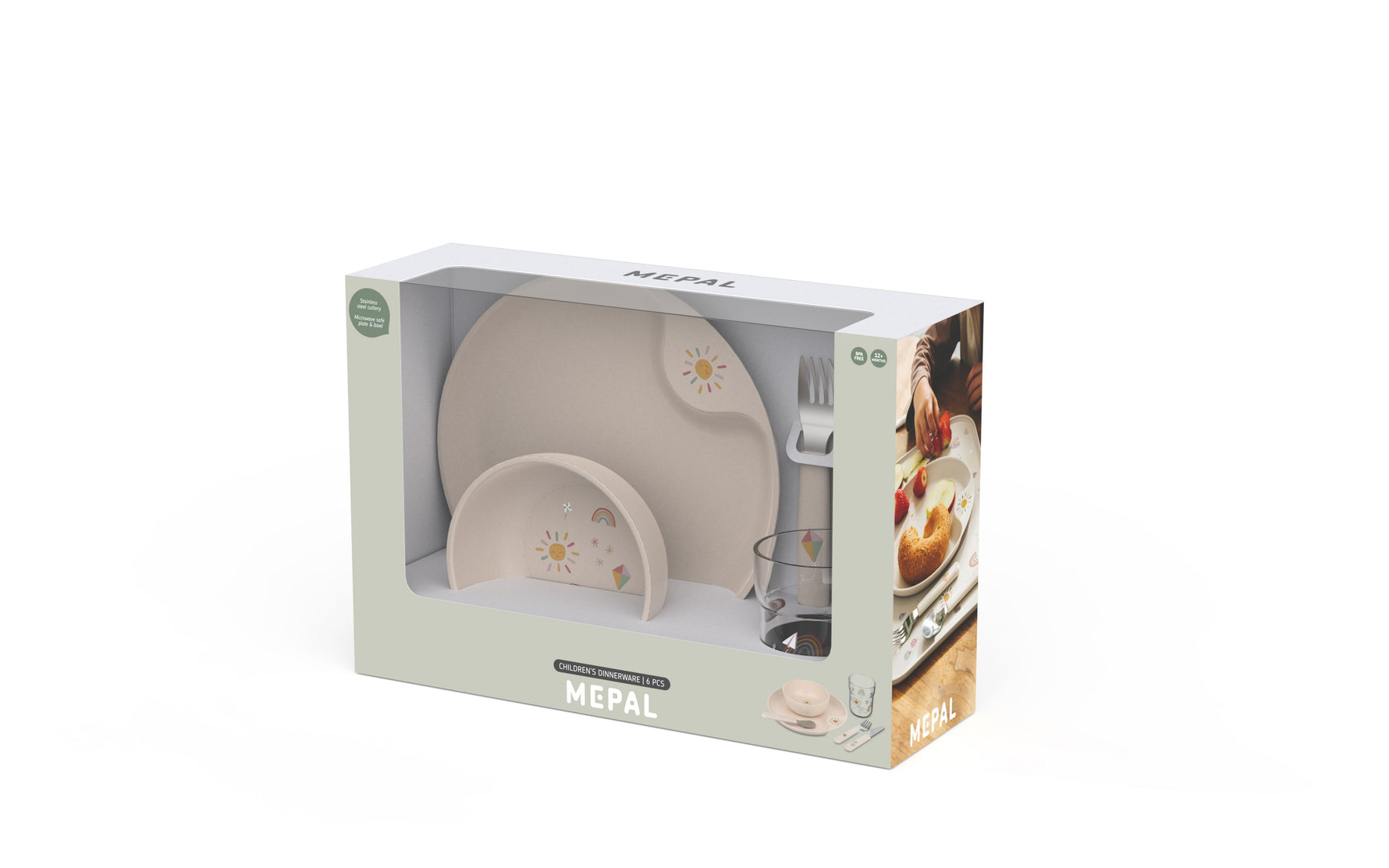 With this 6-pcs Mepal Mio children's dinnerware set in Sunshine & Rainbow, curious little hands can have a good time. In the set you will find a cutlery set, drinking glass, children's bowl and children's plate. The bowl and plate can go in the microwave, so heating up a snack is also childs play. The set comes in a nice packaging, perfect for giving as a present.