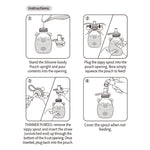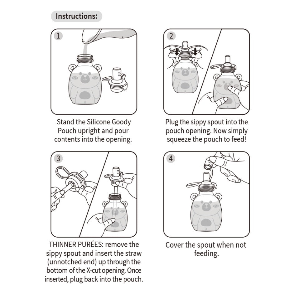 Made of 100% food-grade silicone, the Goody Pouch features clear measurement marks and can be used again and again! Use for any homemade or bulk goodies and give yourself the convenience of store-bought food pouches without the plastic nasties or environmental impact. The 170ml capacity is great for little hands and tummies. The cross-cut variable flow Silicone Sippy Spout lets children feed themselves at their own pace. The included silicone straw can be used for liquids and thinner purées to ensure every last drop is savoured, or for hands that are a bit stronger you can remove the straw and squeeze the pouch, or roll it up from the bottom.