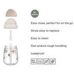 The Mepal Mio 300 ml straw cup in Forest Friends is your perfect travel partner. Hygienic and leakproof. Just slide open and the straw pops out, your child can just do it themselves! The cup is suitable for children from 9 months onwards and helps exercise and develop the jaw muscles. The cup is easy to take apart and can endure rough handling. After use, the straw cup simply goes into the dishwasher and it is BPA-free.