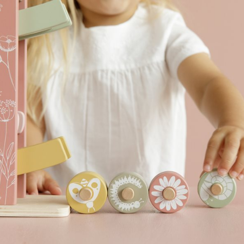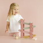 1, 2, 3, and start! With this floral wooden ramp racer including 4 decorated wheels your little one will have a great time. Place the beetle, caterpillar, snail and flower one by one on top of the race track, let them go and they will race down. Kids love this!