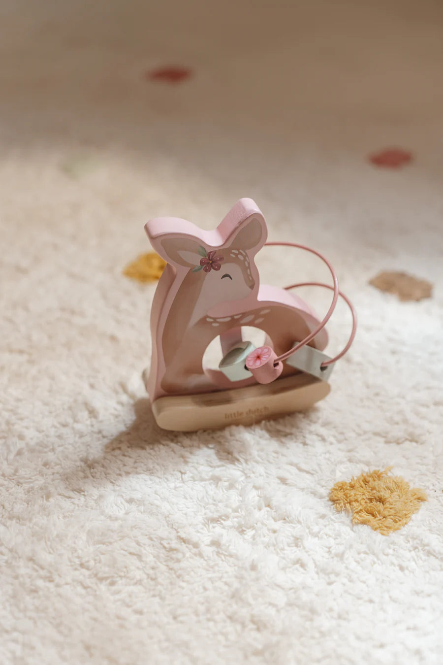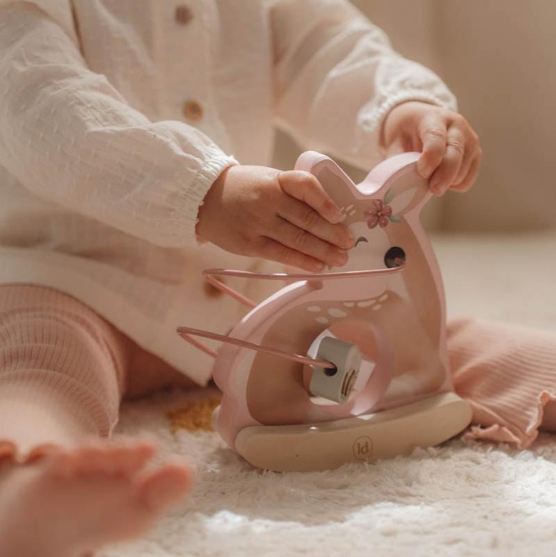 Let the beads spiral around the wooden deer as she rocks back and forth. Encouraging playful interaction, this charming toy invites you to give her a gentle push, setting her in motion to the soft hum of the buzzing bee that flutters around her. Together with the flowers, leaves and mushrooms of Fairy Garden, the bee eagerly navigates the spiral path, dancing across the deer's surface. A delightful fusion of entertainment and decor, this toy not only fosters motor skills but also adds a touch of magic to any playtime experience.
