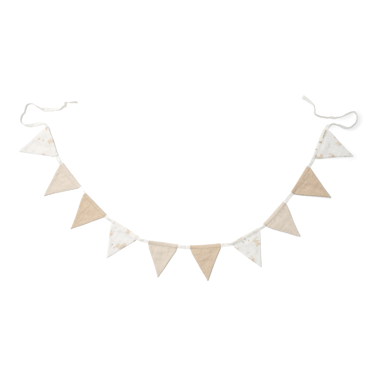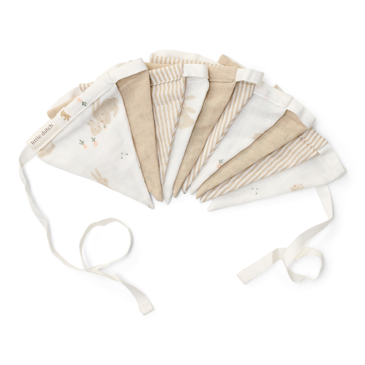 Brighten up the baby's room with this pretty garland. Who says garlands are only for parties! They instantly brighten up a room. On the wall, around the canopy, on a bookshelf or to decorate a play tent. Get creative with this charming fabric garland in soft colour and with sweet Baby Bunny print.