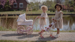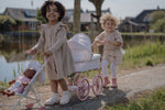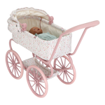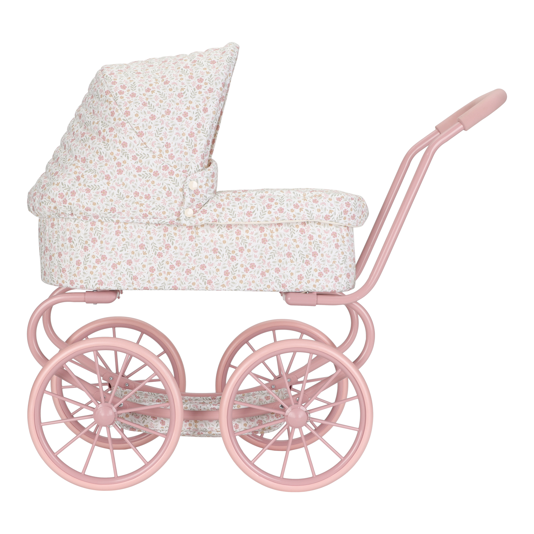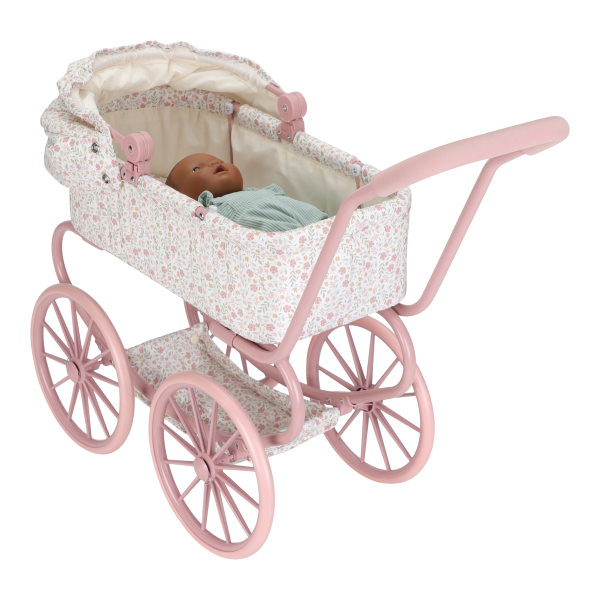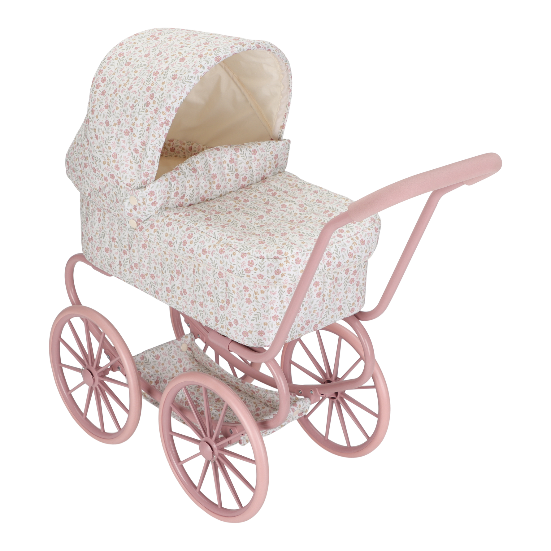 Where will your imagination take you today? Seat your favourite doll or cuddly toy and let the stroller lead the way to a new adventure. The seating is adorned in the enchanting White Meadows design, and the matching bag on the handles provides storage for doll accessories and necessities for a stroll. The strap will keep the baby doll snugly seated during walks. The metal doll stroller with a pink frame, pink handles, and 4 pink wheels is designed to foster imaginative play and nurture a sense of responsibility for little caregivers. It can easily be folded, making storage a breeze. Watch as your little one joyfully pushes the doll stroller around, singing lullabies and pausing to feed or comfort their pretend baby with an infectious sense of tenderness and imagination, all while learning valuable life skills through the magic of play.