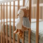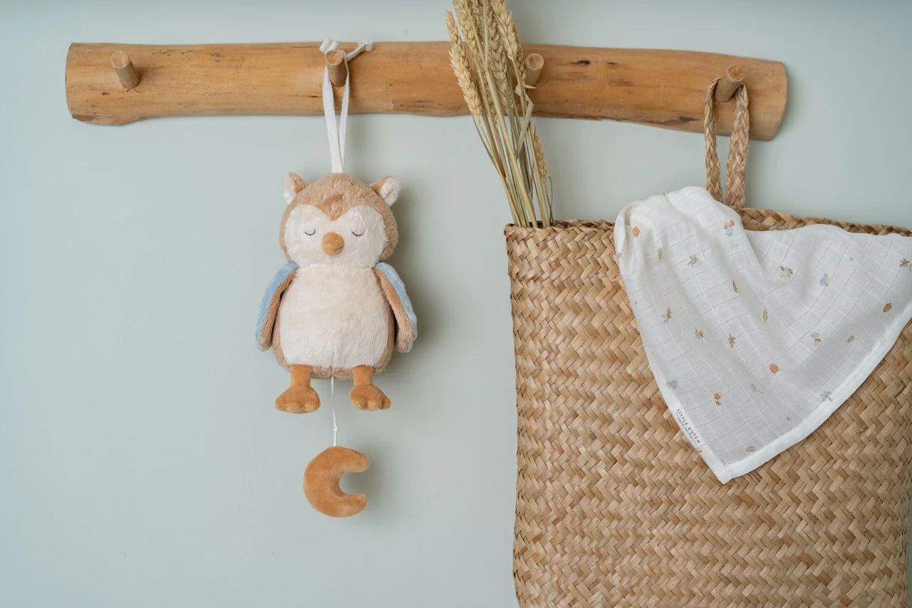 Sweet dreams! This friendly owl will guide you to a dreamland filled with wonder and imagination. Enhance bedtime routines with the enchanting melodies from this playful music box. Pull down the little moon, and the soothing lullaby starts to play as your little one wanders off to sleep. A beautiful gift and a delightful addition to the nursery décor.