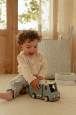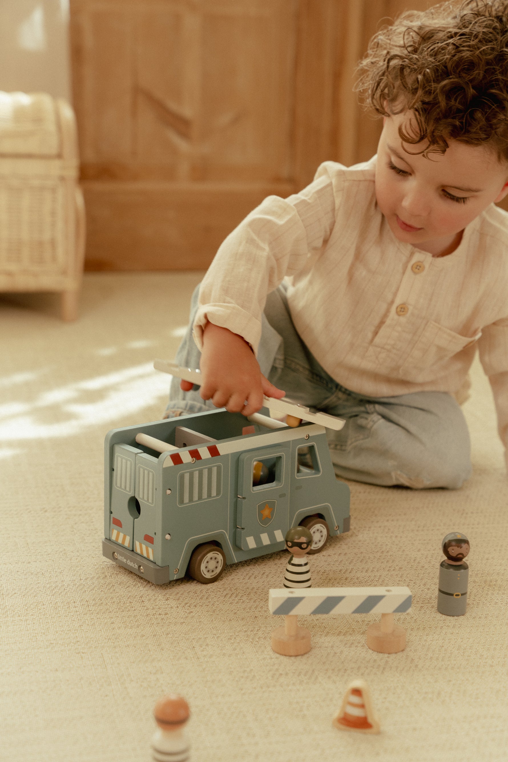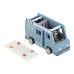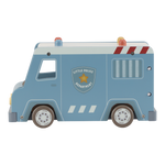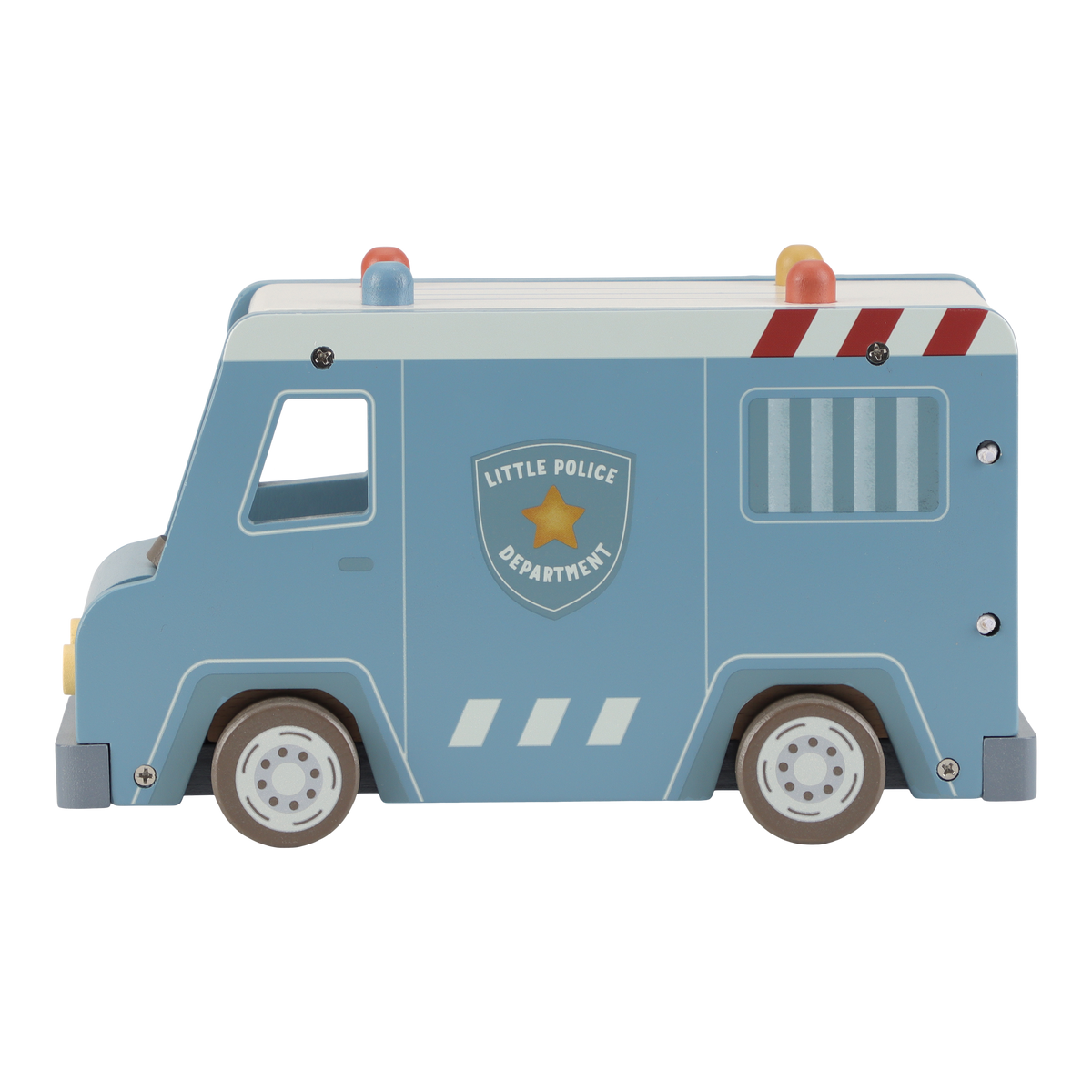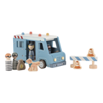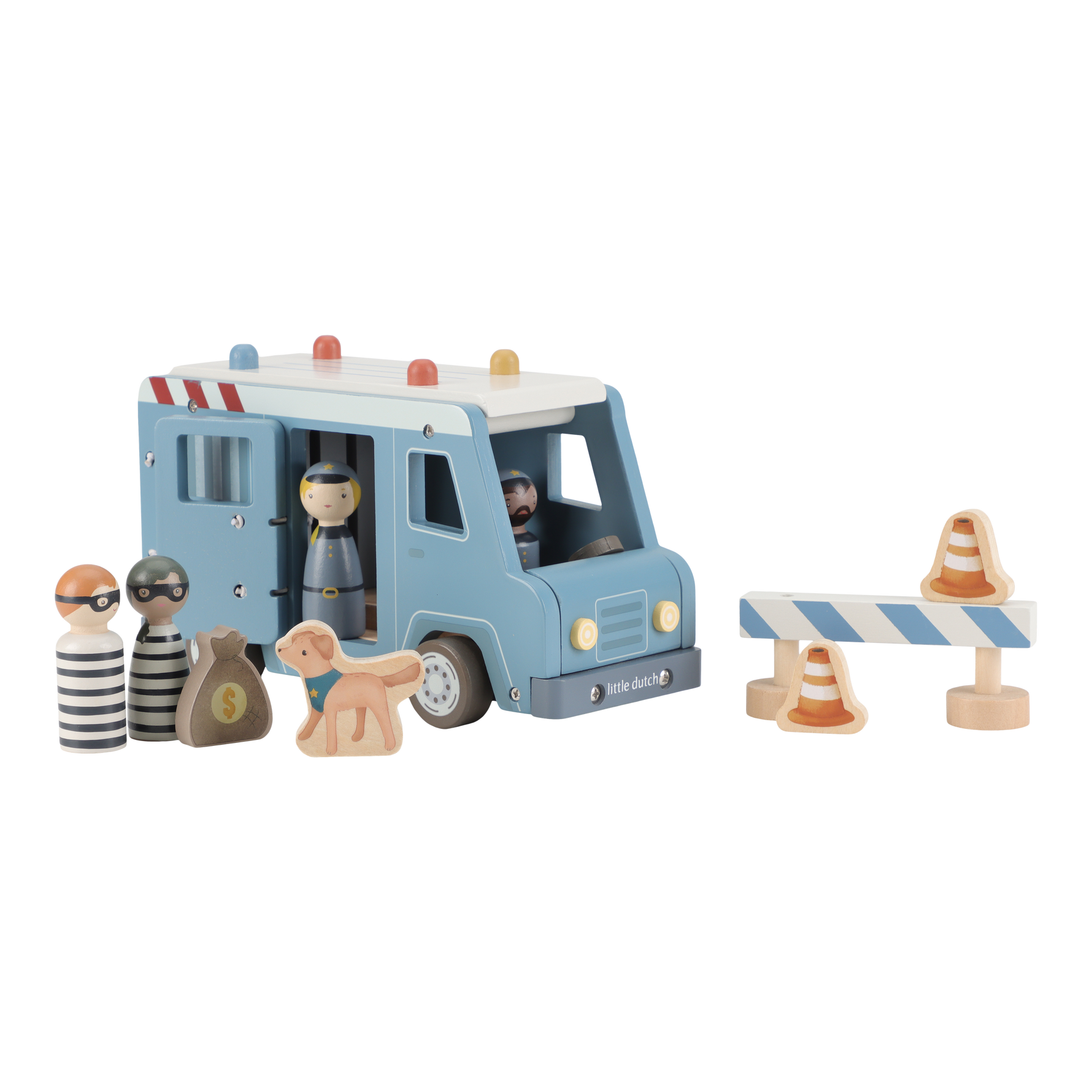 Crooks locked up! This wooden police bus contains four dolls (two policemen and two crooks), a police dog, a bag of money, pilons and a deposit. The bus has a cell with a folding door so that the crooks can be transported safely. Replay exciting police adventures and keep the city safe!