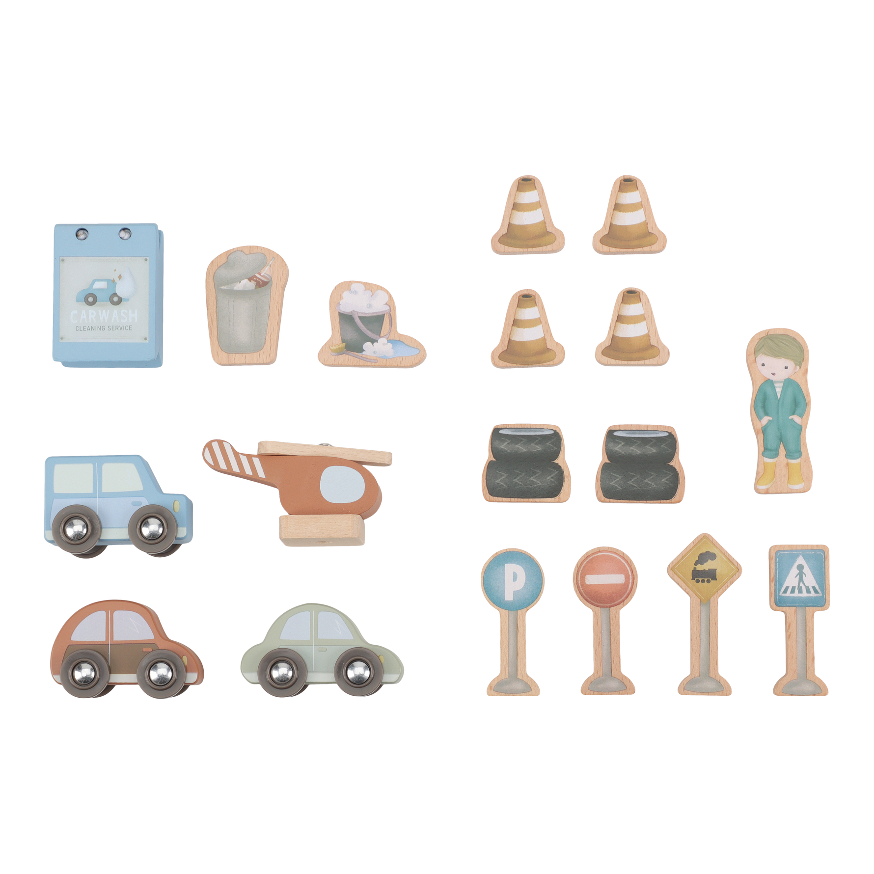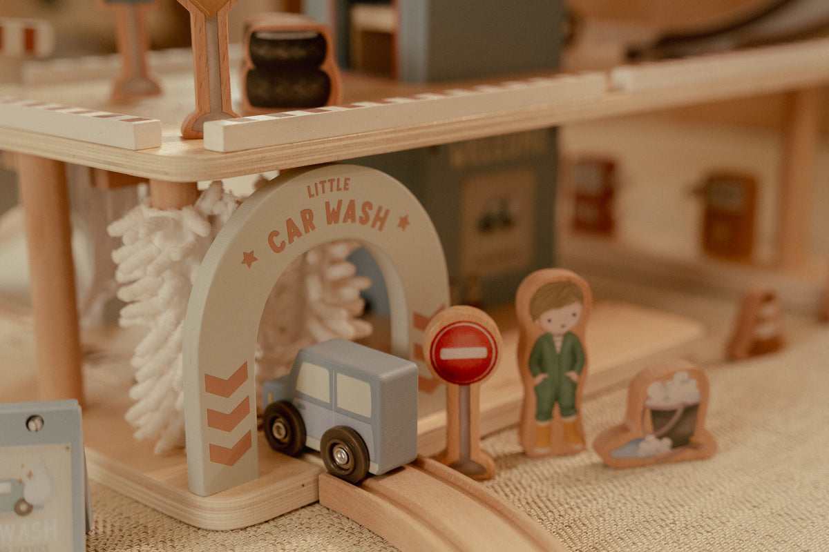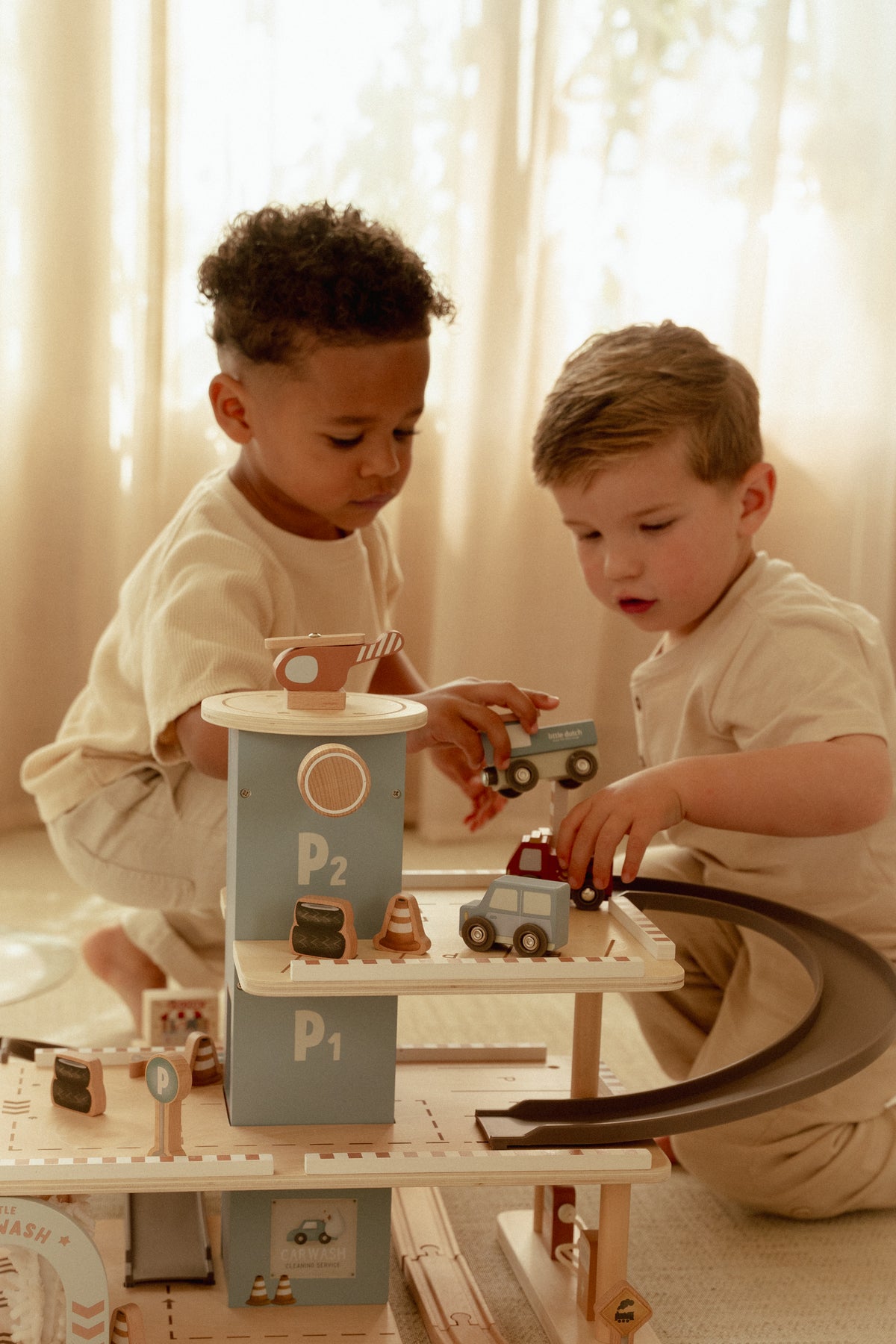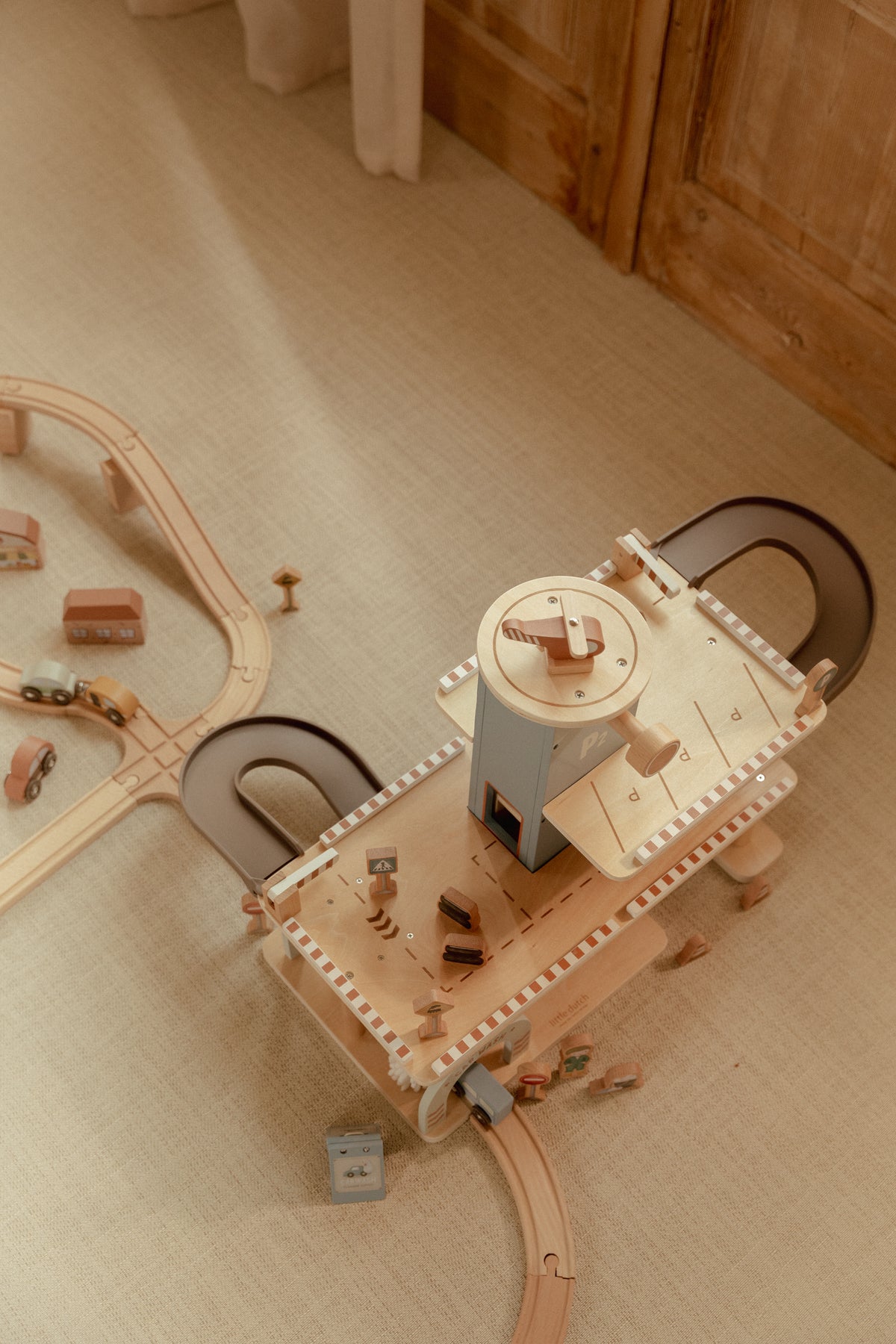 Park, refuel and race! This wooden toy garage is the perfect extension to the Little Dutch Train Track XL. The garage has a ground floor with a car wash, two parking decks and an electric charging station, and on top of a helicopter platform. Including wooden accessories such as road signs, stacking straps and a bucket. Three vehicles and a helicopter are also included. Drive up, park your car or fly by helicopter to your destination. Endless fun guaranteed!