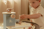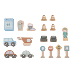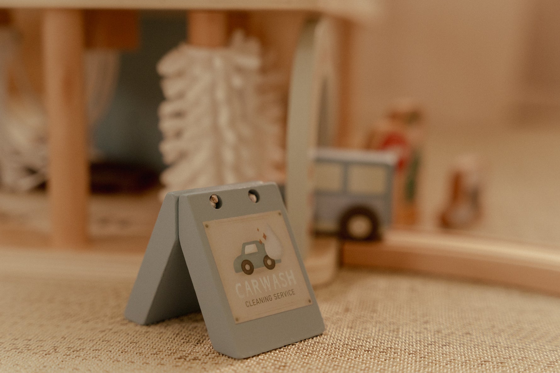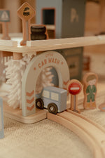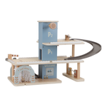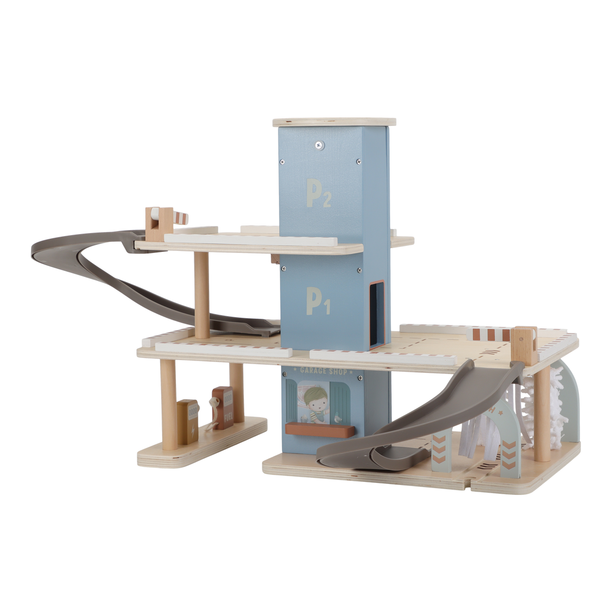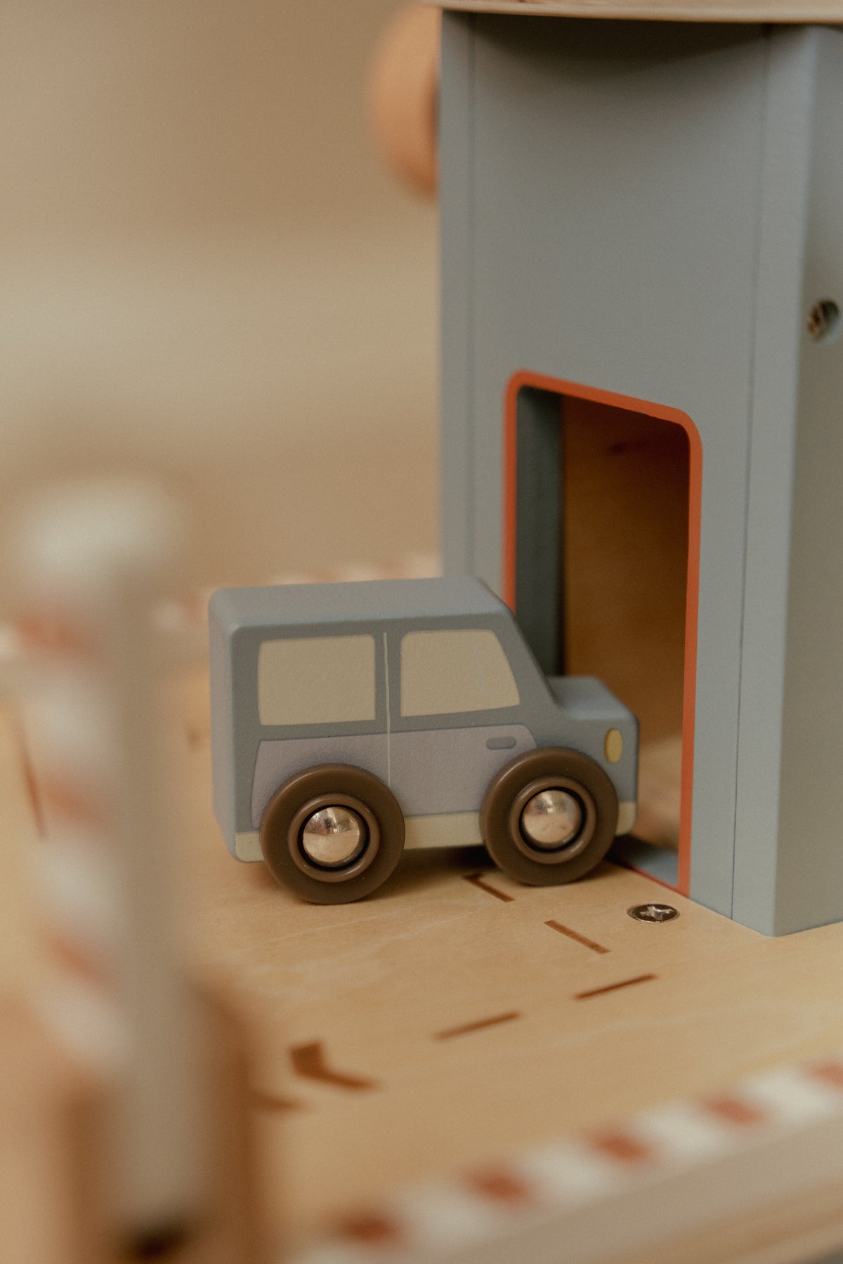 Park, refuel and race! This wooden toy garage is the perfect extension to the Little Dutch Train Track XL. The garage has a ground floor with a car wash, two parking decks and an electric charging station, and on top of a helicopter platform. Including wooden accessories such as road signs, stacking straps and a bucket. Three vehicles and a helicopter are also included. Drive up, park your car or fly by helicopter to your destination. Endless fun guaranteed!